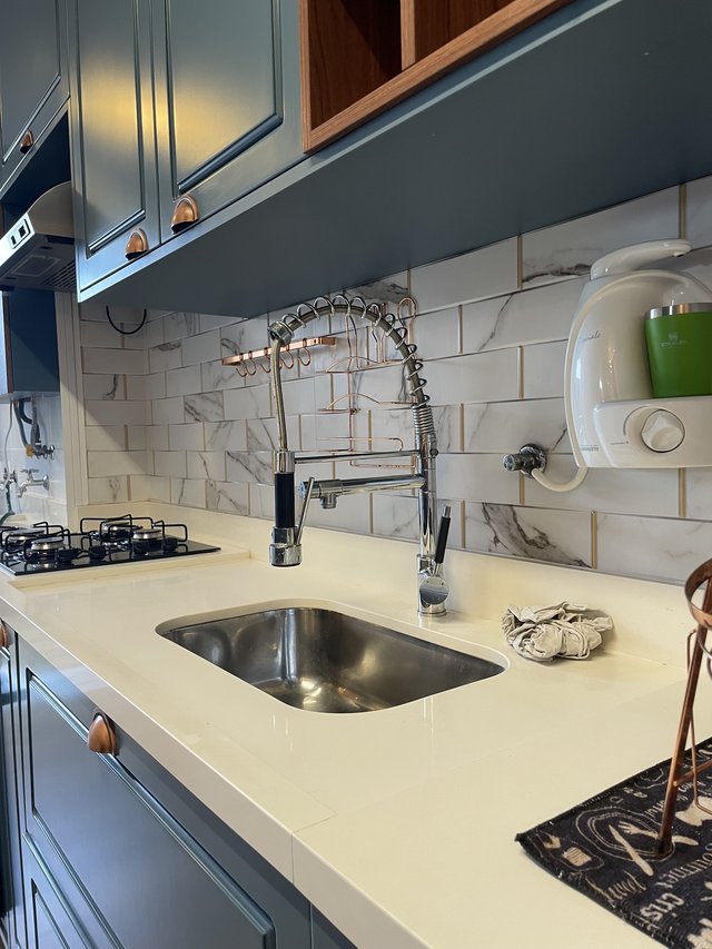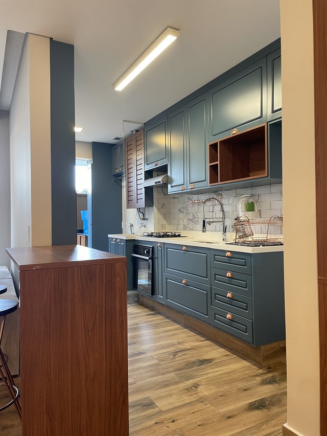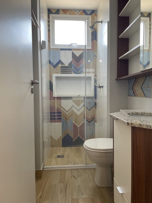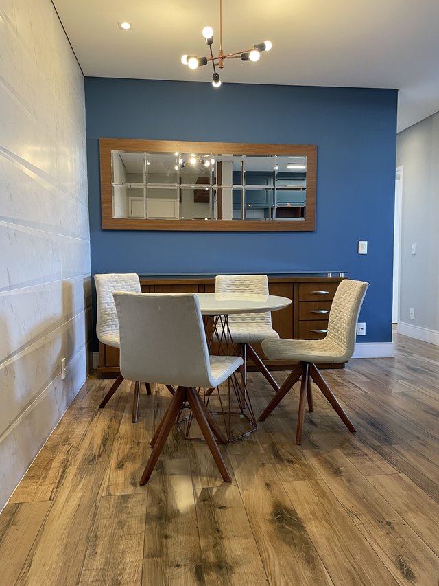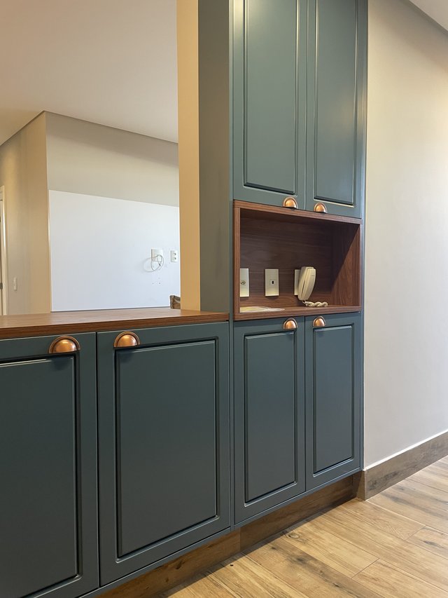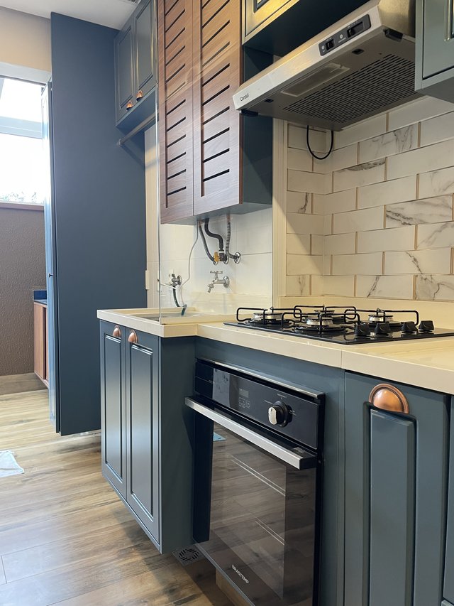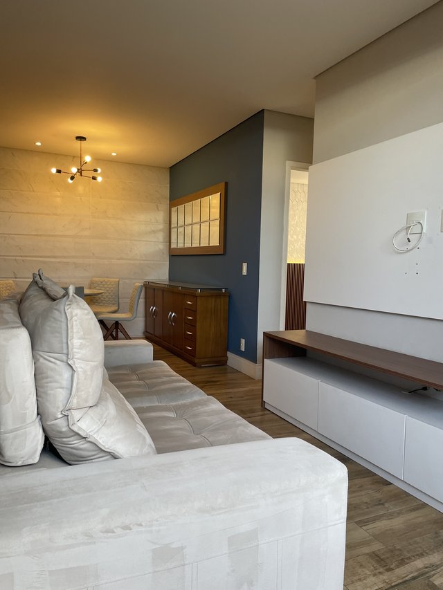 Apartamento de 2 dormitórios, com garden, espaço livre e coberto, semi mobiliado, com móveis planejados na cozinha e quarto, sofá, mesa, exaustor, cooktop e forno.